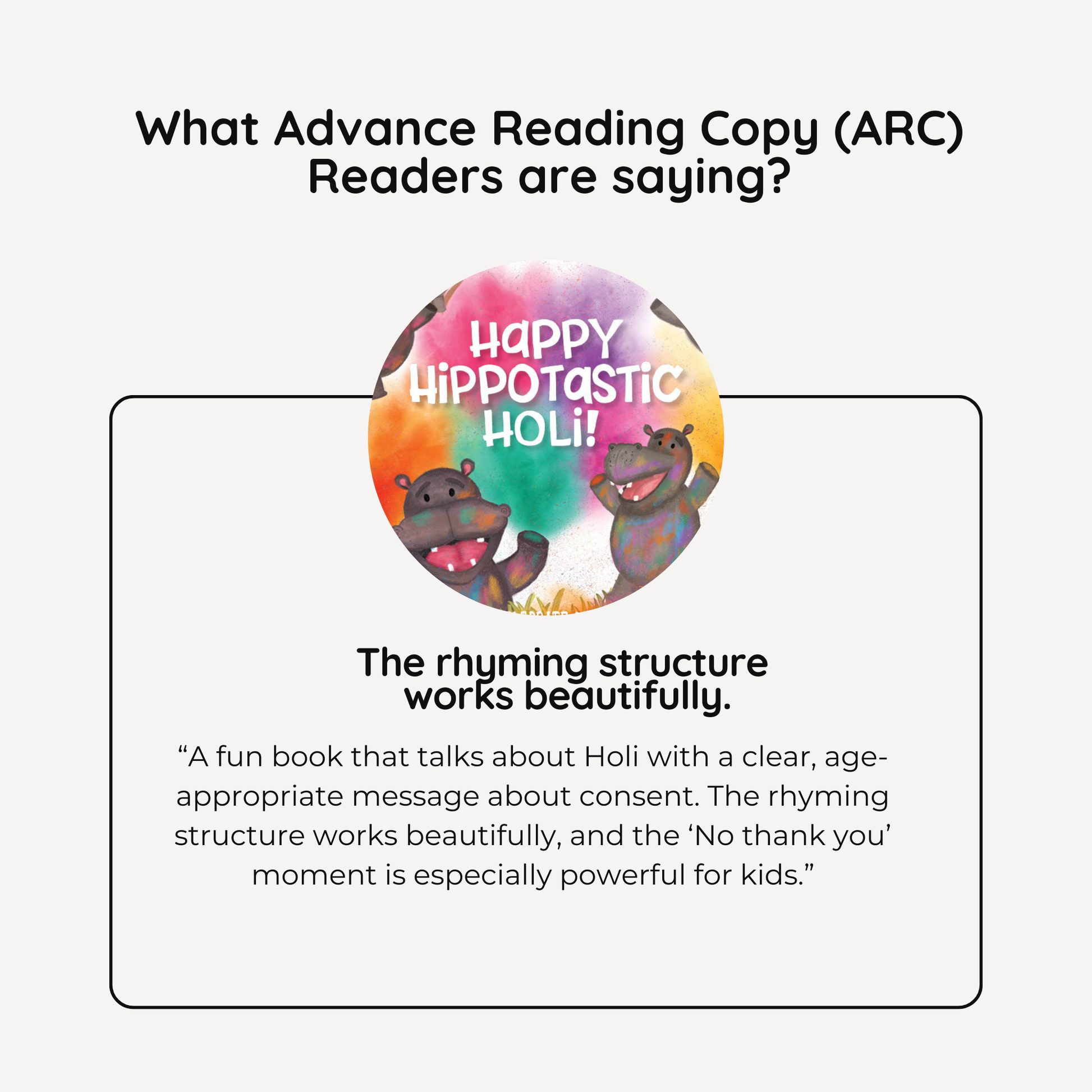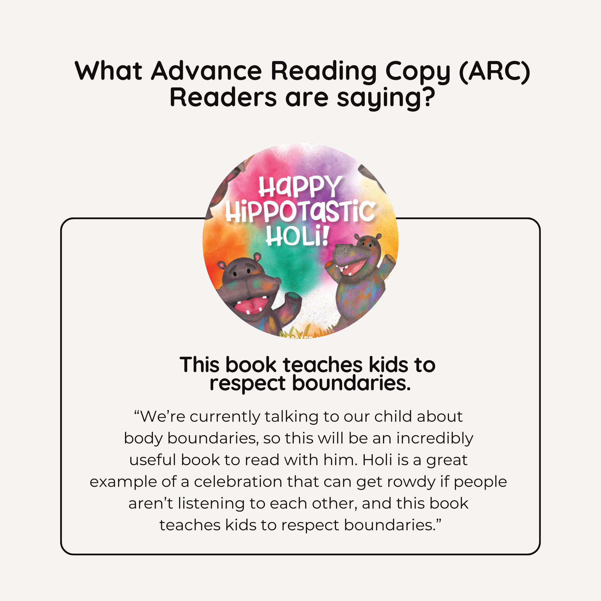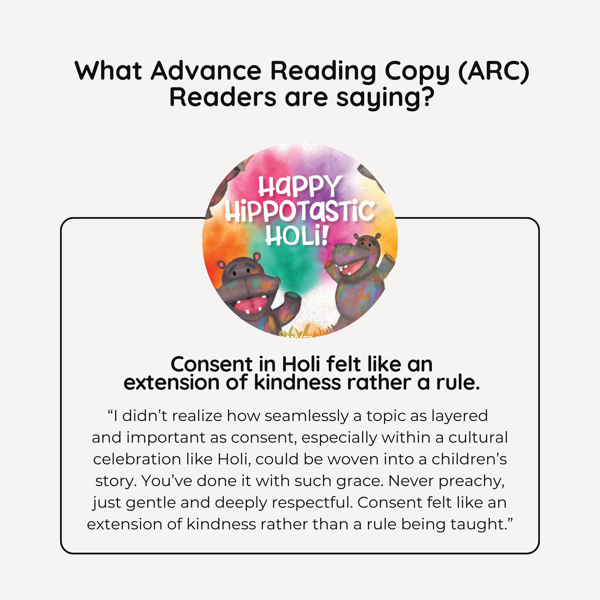 In this joyful rhyming picture book, hippos stomp, dance, and share color while modeling that a yes, a no, or quiet watching from afar all belong at Holi.